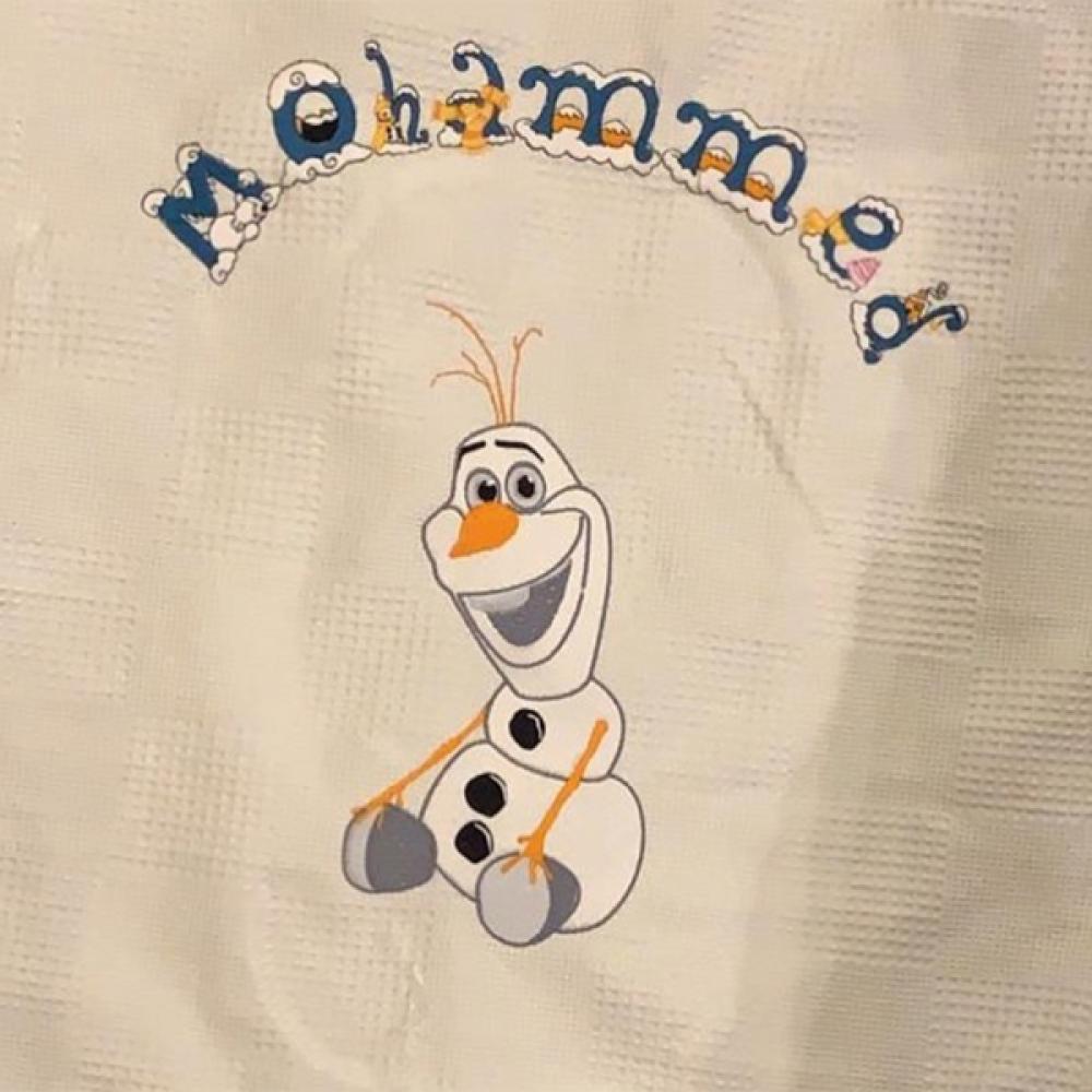 التطريز على طقم مواليد باسم المولود. الطقم مكون من بربتوز،فانيلة داخلية، قفازين، بيت الرضاعة، طاقية، كوفالة . الطقم مصنوع من أجود أنوع القطن في سوريا أو تركيا.